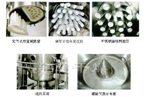 將制粒用的粉末物料放入流化床內(nèi),物料粉末粒子在原料容器中呈環(huán)形流化狀態(tài),受到經(jīng)過凈化后的加熱空氣預熱和混合,將粘合劑溶液霧化噴入,使若干粒子聚集成含有粘合劑的團粒,由于熱空氣對物料的不斷干燥,使團粒中水分蒸發(fā),粘合劑凝固,此過程不斷重復進行,形成理想的、均勻的多微孔球狀顆粒。